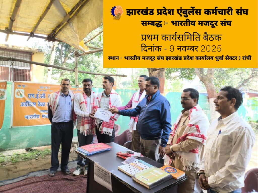 आज दिनांक 9 नवंबर 2025 को झारखंड प्रदेश एम्बुलेंस कर्मचारी संघ, झारखंड प्रदेश (इकाई: भारतीय मजदूर संघ) की कार्यसमिति बैठक का आयोजन किया गया। बैठक में प्रदेश के सभी पदाधिकारीगण, जिला अध्यक्षगण एवं जिला सचिवगण उपस्थित रहे।