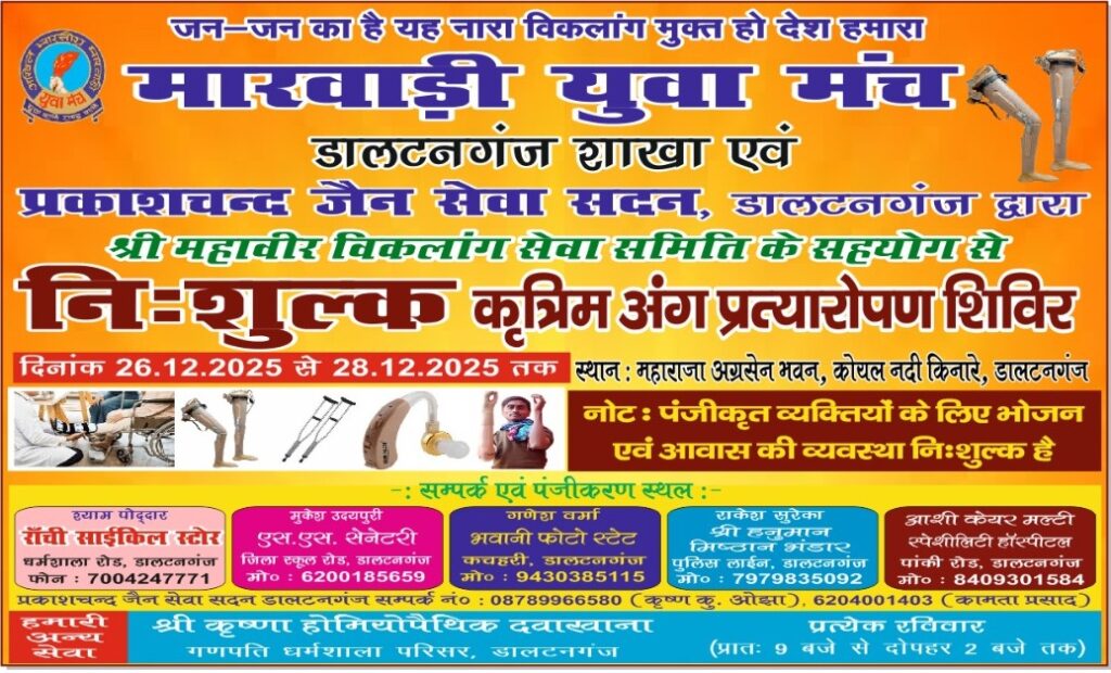 26 से 28 दिसंबर तक मेदिनीनगर में निशुल्क कृत्रिम अंग प्रत्यारोपण शिविर