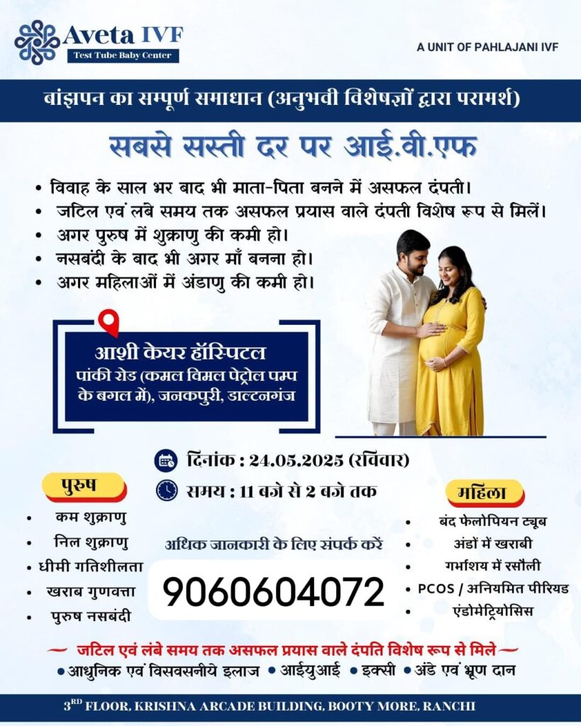 दिनाँक 24 मई 2025 दिन- शनिवार को सुबह 11.00 बजे से 02:00 बजे तक निःसंतान दंपत्तियों के लिए अवेटा हॉस्पिटल IVF (राँची) की चिकित्सकीय टीम द्वारा निःशुल्क परामर्श शिविर का आयोजन किया गया है।