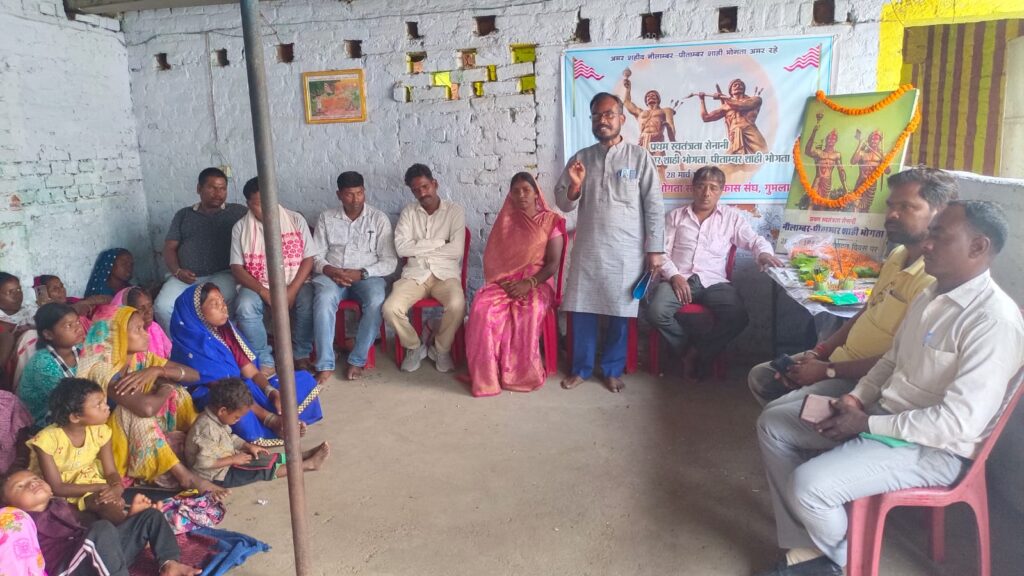 खरवार भोगता समाज विकास संघ गुमला द्वारा पालकोट रोड स्थित होटल सिंह जी का ढाबा के सभागार में शनिवार को अमर शहीद नीलांबर-पीतांबर का 167 वां शहादत दिवस मनाया गया। मुख्य अतिथि खरवार भोगता समाज विकास संघ के प्रमंडलीय अध्यक्ष मंगल सिंह भोगता ने कहा कि देश व समाज की रक्षा के नीलांबर और पीतांबर दोनों भाई ने 35 वर्ष की उम्र में अपनी कुर्बानी दी थी। वर्तमान में लोग अपने व्यक्ति जीवन की सोच रहे हैं। अस्सी- सौ वर्ष जीने के लिए परेशान हैं। नीलांबर पीतांबर का जीवन प्रेरणा देता है कि कम समय ही जिएं लेकिन अपने समाज और देश के लिए जिएं। उनका सपना शिक्षित समाज और संगठित समाज का था। उनके आदर्शों को आत्मसात करना ही उनके लिए सच्ची श्रद्धांजलि होगी। इस अवसर पर खरवार भोगता समाज विकास संघ के जिला अध्यक्ष जितु प्रधान, सचिव भरत प्रधान, शिव शंकर भोगता, हीरालाल प्रधान, डब्लू प्रधान, रंथा प्रधान आदि ने अपने-अपने विचार व्यक्त किए और अमर शहीद नीलांबर पीतांबर को श्रद्धा सुमन अर्पित कर उन्हें श्रद्धांजलि दी। कार्यक्रम में कपिल प्रधान, राम प्रधान, थोलो प्रधान, प्रवीण प्रधान, फुलमनी देवी, अंजली देवी, सुमती देवी, संपति देवी, रोहिनी कुमारी, ममता कुमारी, रोबिना कुमारी, भुवनेश्वर प्रधान, राजू प्रधान, रंथी कुमारी, सीताराम प्रधान, हरकेश्वर प्रधान, प्रीतम प्रधान आदि शामिल थे।