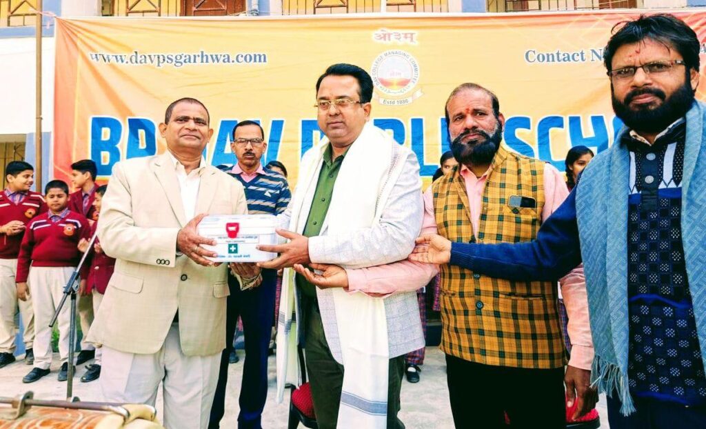 गढ़वा । आर.पी. एजुकेशनल एंड वेलफेयर ट्रस्ट की और से फरठिया स्थित बीपी डीएवी पब्लिक स्कूल में छात्र- छात्राओं के लिए मेडिकल किट और वेट मशीन वितरण किया गया। छात्रहित में किए गए इस कार्य के लिए बीपी डीएवी स्कूल के प्राचार्य आर. के. सिन्हा ने आर.पी. एजुकेशनल एंड वेलफेयर ट्रस्ट के निदेशक डॉक्टर पातंजली केशरी को शाॅल ओढ़ाकर सम्मानित किया ।