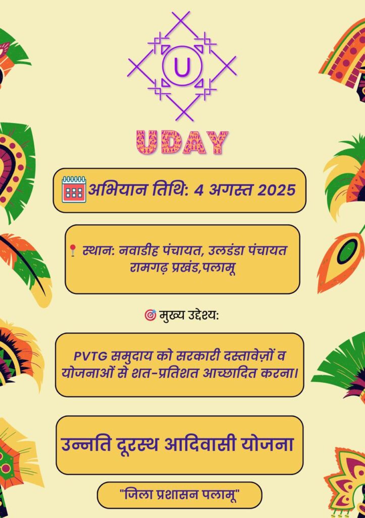 जिले की उपायुक्त सह जिला दंडाधिकारी समीरा एस द्वारा पीवीटीजी समूह के लिये एक विशेष पहल की गयी है।उन्होंने उन्नति दूरस्थ आदिवासी योजना “UDAY”नामक योजना की शुरुआत की है।इस योजना के तहत पीवीटीजी समूह को उनके जो अधिकार से आच्छादित करना है।इस कार्यक्रम अंतर्गत पायलट प्रोजेक्ट के तहत रामगढ़ प्रखंड के नवाडीह और उलडंडा पंचायत को चुना गया है।आगामी 4 अगस्त को इन दोनों पंचायतों में विशेष शिविर लगाकर आदिम जनजाति परिवारों के बीच आधार कार्ड,जॉब कार्ड,वन पट्टा,राशन कार्ड,जन्म प्रमाण पत्र, आयुष्मान कार्ड जाति एवं आवास या प्रमाण पत्र लैंड होल्डिंग एवं इम्यूनाइजेशन से आच्छादित किया जायेगा।इसके अलावे जिनका बैंक में खाता नहीं है उनका अकाउंट ओपनिंग करवाया जाएगा।इस संबंध में उपायुक्त सह जिला दंडाधिकारी ने बताया कि प्रायः ऐसा देखा गया है कि सिर्फ डॉक्यूमेंट नहीं रहने के कारण पीवीटीजी परिवारों को सरकार की कल्याणकारी योजनाओं से वंचित रहना पड़ता है।ऐसे में इस “UDAY”पहल के तहत उनके सारे डॉक्यूमेंट बनाए जाने का कार्य किया जायेगा जो उनका अधिकार भी है।एक बार जब उनका सारा डॉक्यूमेंट बनकर उन्हें मिल जाएगा तो भविष्य में उन्हें किसी भी प्रकार की सरकारी योजनाओं से वंचित नहीं होना पड़ेगा।अभी पायलट प्रोजेक्ट के तहत रामगढ़ के नवाडीह और उलडंडा पंचायत से इस पहल की शुरुआत की जा रही है।कार्यक्रम की सफलता के बाद इसे संपूर्ण जिले में लागू किया जाएगा।ज्ञातव्य है कि उपरोक्त दोनों पंचायतों में डॉक्यूमेंट से छूटे हुए लाभुकों का सर्वे पूर्व में ही करा लिया गया है एवं सभी से विभिन्न-विभिन्न आवेदन प्राप्त कर लिए गये हैं।