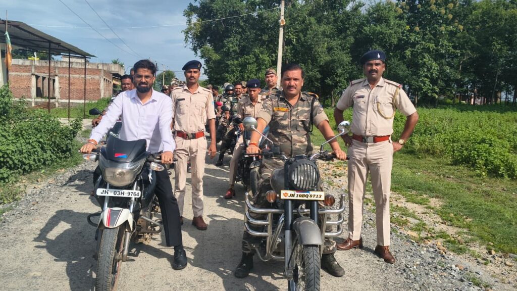 पाटन (पलामू ): पाटन प्रखंड के पाल्हेकला पंचायत में प्रखंड विकास पदाधिकारी-सह- अंचल अधिकारी पाटन डॉ अमित कुमार झा एवं पाटन थाना प्रभारी शशि शेखर पाण्डेय के नेतृत्व में ईद उल मिलाद कों लेकर गुरुवार कों पाल्हेकला मे फ्लैग मार्च निकाला गया!फ्लैग मार्च के दौरान पाटन बीडीओ सह अंचल पदाधिकारी ने बताया कि ईद और मिलाद को आपसी भाईचारा के साथ संपन्न करे कोई भी असामाजिक तत्व के द्वारा आपसी भाईचारा को बिगड़ने की कोशिश की गई तो उन पर सख्त सख्त कानूनी कार्रवाई की जाएगी इस मौके पर कल्याण पदाधिकारी अजित कुमार मिश्रा एवं कई पुलिस पदाधिकारी व जवान मौजूद रहे
