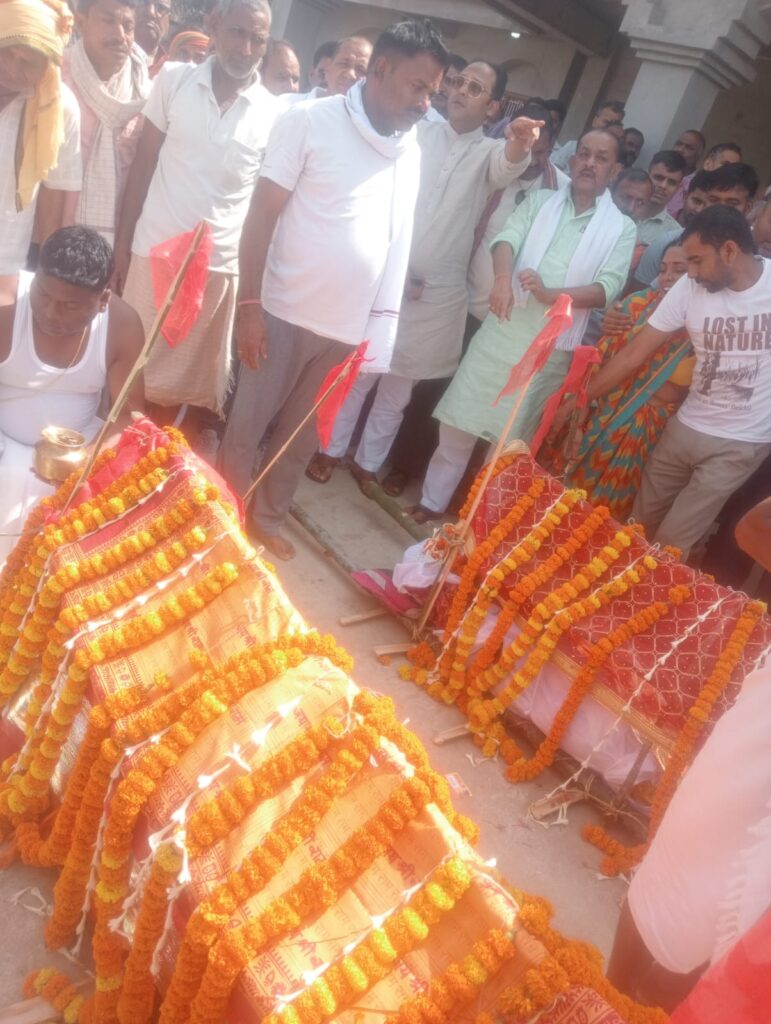पाटन (पलामू): पाटन प्रखंड के सगुना पंचायत में बुधवार की रात एक हृदयविदारक घटना सामने आई, जहां पूर्व मुखिया अखिलेश पांडे के माता-पिता का कुछ ही घंटों के अंतराल में निधन हो गया। प्राप्त जानकारी के अनुसार, पहले माता रूपनी देवी (75 वर्ष) का रात करीब 9:00 बजे निधन हुआ। पत्नी के निधन के गम को सहन नहीं कर पाने के कारण कुछ ही घंटे बाद रात लगभग 12:00 बजे पिता योगेश्वर पांडे (95 वर्ष) ने भी अंतिम सांस ली।एक ही रात में पति-पत्नी की मौत की खबर से पूरे गांव में मातम पसर गया। इस घटना ने सभी को भावुक कर दिया और क्षेत्र में यह चर्चा का विषय बना हुआ है। ग्रामीणों का कहना है कि दोनों के बीच गहरा लगाव था और एक के जाने के बाद दूसरे ने भी दुनिया छोड़ दी।
