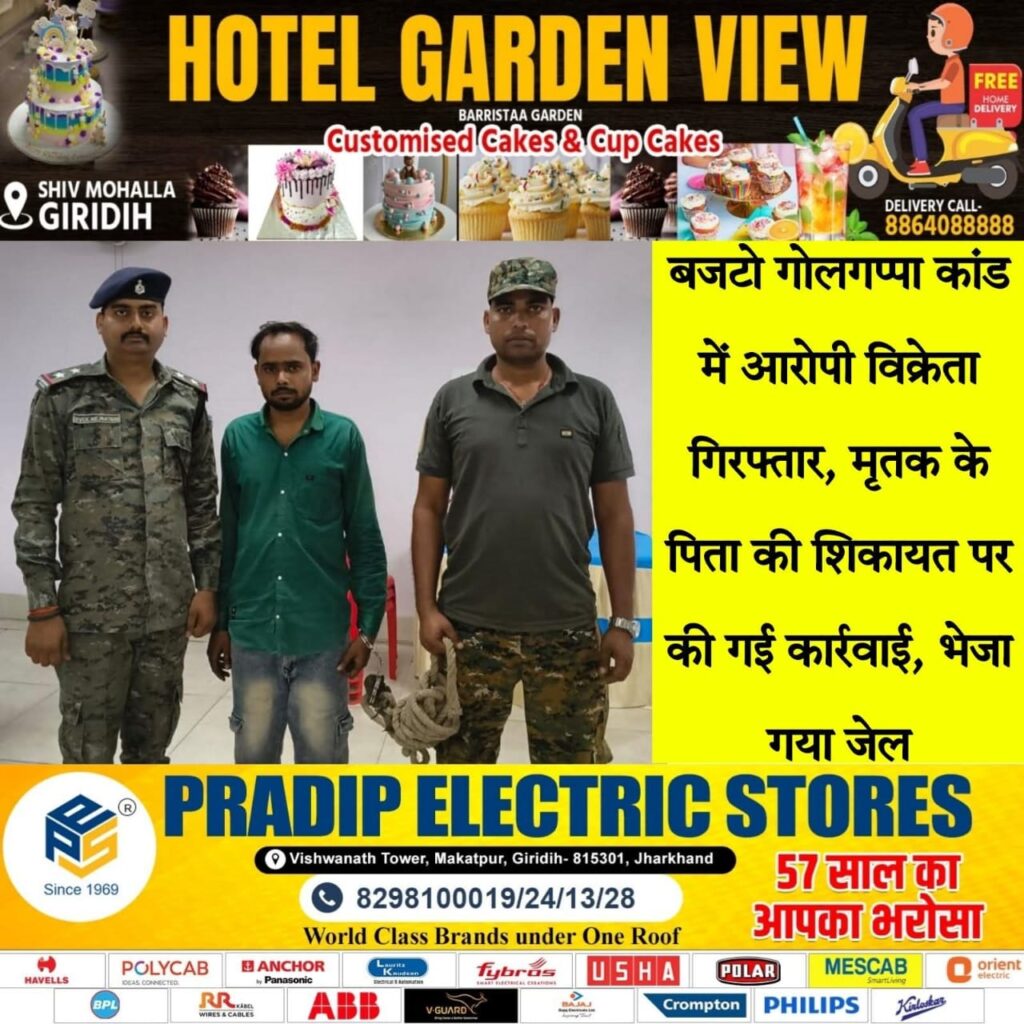 गिरिडीह। सदर प्रखंड के बजटो गांव में हुए फूड पॉइजनिंग कांड को लेकर प्रशासन और पुलिस ने सख्त रुख अपनाया है। मामले में त्वरित कार्रवाई करते हुए मुफस्सिल थाना पुलिस ने आरोपी गुपचुप (गोलगप्पा) विक्रेता ओभी लाल रजक को गिरफ्तार कर न्यायिक हिरासत में जेल भेज दिया है।