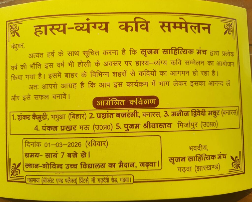 “गढ़वा में होली पर हास्य-व्यंग्य कवि सम्मेलन, देशभर के कवि देंगे रंगीन प्रस्तुति”