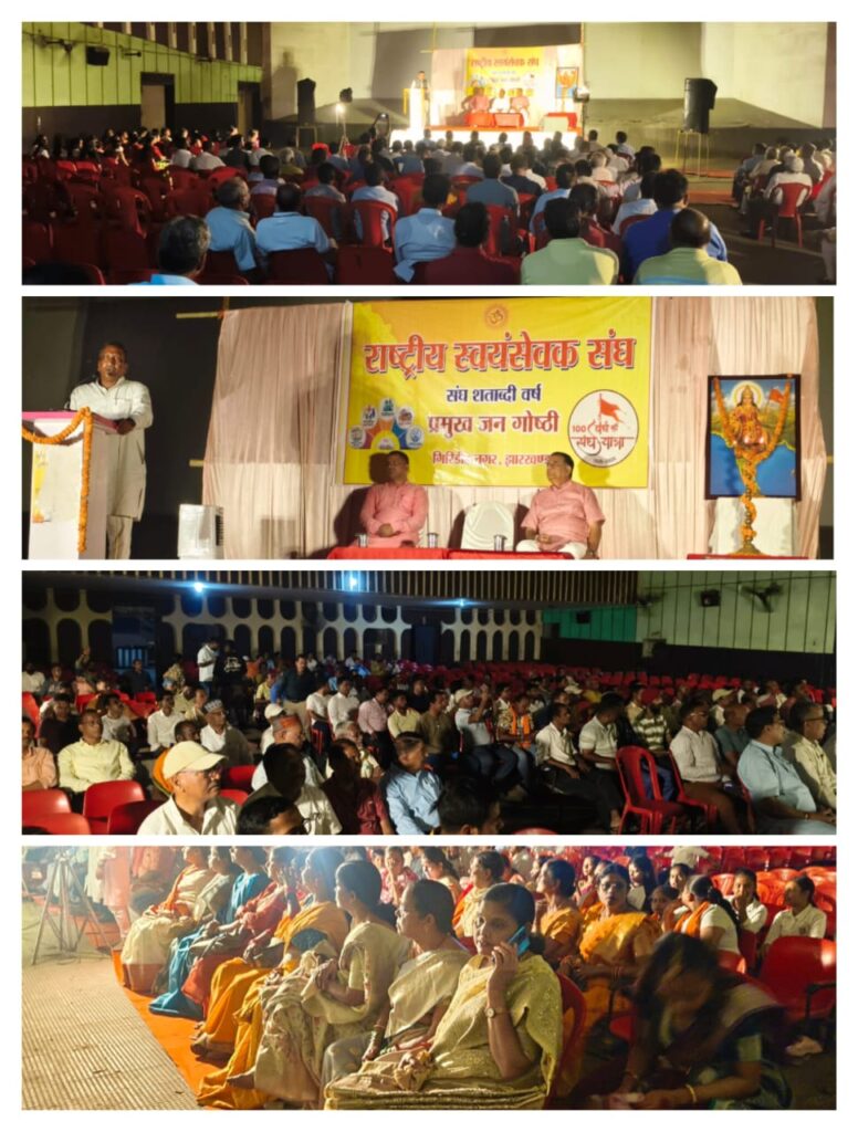गिरिडीह स्थित सवेरा चित्र मंदिर के परिसर में आज एक भव्य एवं विचारोत्तेजक प्रमुख जन गोष्ठी का आयोजन किया गया। इस गरिमामय कार्यक्रम में राष्ट्रीय स्वयंसेवक संघ के अखिल भारतीय सह सेवा प्रमुख श्री राजकुमार मटालेजी मुख्य वक्ता के रूप में उपस्थित रहे। कार्यक्रम में समाज के विभिन्न क्षेत्रों—शिक्षा, प्रशासन, चिकित्सा, मीडिया एवं सामाजिक जीवन—से जुड़े बड़ी संख्या में प्रबुद्धजन सम्मिलित हुए।