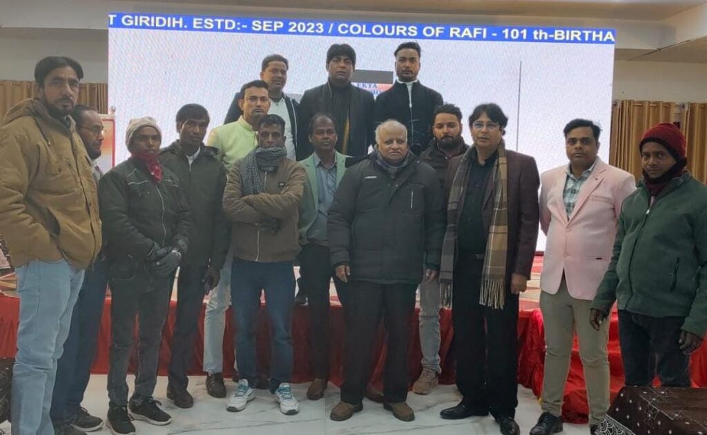 होटल संगम गार्डन में “एकता कल्चरल फाउंडेशन” के द्वारा मोहम्मद रफ़ी साहब के 101 जन्मदिन बड़ी ही धूमधाम के साथ मनाया गया, जिसमें सभी गायकों ने अपने सुरों के माध्यम से अपनी गायकी प्रस्तुत किए, जो एकता कल्चरल फाउंडेशन के अध्यक्ष बबलू सानू ने अपनी गायकी से मुख्य अतिथि व लोगों के बीच समा बांधे हुए रखें, साथ सभी गायकों ने भी बेहतरीन प्रदर्शन किए, इस कार्यक्रम में मुख्य अतिथि रुप में dsp कौशर अली, झामुमो कार्यकर्ता व समाजसेवी इरशाद अहमद वारिस, सिटी न्यूज के ब्यूरो चीफ अभिषेक सहाय, अली आर्ट्स के ऑनर कौशर अली,औरिद चन्द्रा, गोपाल जी,दया शंकर सिंह,शबीर मास्टर मुख्य रूप से शामिल रहे, जिसमें सभी अतिथियों को बुके, शॉल और मोमेंटो देकर सम्मानित किया गया ।
