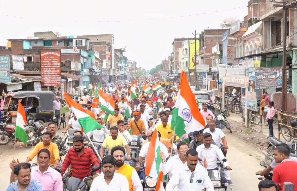 रैली का शुभारंभ हुसैनाबाद स्थित पूर्व मंत्री के आवासीय कार्यालय से हुआ, जो नहर मोड़, जयप्रकाश चौक, अंबेडकर चौक, गांधी चौक, भट्ठी मोहल्ला होते हुए पुनः आवासीय कार्यालय पर आकर संपन्न हुई। सैकड़ों मोटरसाइकिलों के साथ निकली यह यात्रा नगर के हर कोने में देशभक्ति का संदेश देती रही। हाथों में तिरंगा थामे कार्यकर्ता और नागरिक “भारत माता की जय” तथा “जय हिंद” के नारों के साथ आगे बढ़ते रहे। पूरे मार्ग में देशभक्ति गीत “मेरी जान तिरंगा है” की धुन गूंजती रही, जिसने माहौल को और भी उत्साहपूर्ण बना दिया।