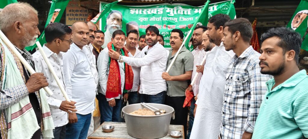 पलामू – झारखंड मुक्ति मोर्चा (झामुमो) युवा मोर्चा, पलामू द्वारा आज छः मुहान काली मंदिर परिसर में दिशोम गुरु शिबू सोरेन जी एवं शिक्षा मंत्री रामदास सोरेन जी के शीघ्र स्वस्थ होने की कामना को लेकर एक दिवसीय भंडारे का आयोजन किया गया, जो पूरी श्रद्धा और सेवा भावना के साथ आयोजन हुआ ।आज जगत कुटीर, झामुमो कार्यालय से झामुमो जिला अध्यक्ष श्री राजेन्द्र प्रसाद सिन्हा जी के नेतृत्व में कार्यकर्ता एकत्र होकर काली मंदिर प्रांगण तक पहुंचे, जहाँ उन्होंने पूजा-अर्चना कर वरिष्ठ नेता शिबू सोरेन जी एवं शिक्षा मंत्री श्री रामदास सोरेन जी की उत्तम स्वास्थ्य हेतु सामूहिक प्रार्थना की।भंडारे में सैकड़ों की संख्या में आमजन, पार्टी कार्यकर्ता, पदाधिकारी तथा स्थानीय निवासी उपस्थित रहे। प्रसाद वितरण के दौरान सामाजिक सौहार्द, एकता और सेवा भाव का सुंदर उदाहरण देखने को मिला। पलामू जिला अध्यक्ष राजेन्द्र प्रसाद सिंहा जी ने इस मौके पर कहा:दिशोम गुरु हमारे प्रेरणास्त्रोत हैं। उनके शीघ्र स्वस्थ होने की कामना के साथ हम सभी ने यह आयोजन पूरी निष्ठा से किया है।कार्यक्रम में झामुमो के केंद्रीय समिति सदस्य सनू सिद्दीकी एवं जिला स्तरीय पदाधिकारी उपाध्यक्ष राकेश कुमार सिंहा, संगठन सचिव देवानंद भारद्वाज, युवा मोर्चा अध्यक्ष सूरज कुमार,सचिव कौशल किशोर, उपाध्यक्ष रिशु अग्रवाल,रजनीश सिंह, अरविंद चौधरी,संजय चंद्रवंशी, व्यवसाय मोर्चा अध्यक्ष दीपू चौरसिया,किसान मोर्चा अध्यक्ष वशिष्ठ सिंह, संतोष उपाध्याय सहित कमेटियों के सदस्यगण भी सक्रिय रूप से शामिल हुए और कार्यक्रम को सफल बनाया।