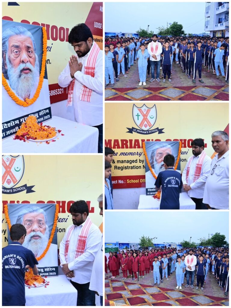 अपने संत मरियम विद्यालय के बच्चों को गुरुजी के जीवन परिचय से अवगत कराया और दो मिनट का मौन रख तस्वीर पर माल्यार्पण अर्पित कर नमन किए। गुरु जी के पार्थिव शरीर दिल्ली से रांची लाया जा रहा है संभवतः कल 05 अगस्त को उनका शवयात्रा निकाला जाएगा। पुनः श्रद्धांजलि अर्पित करते हैं।