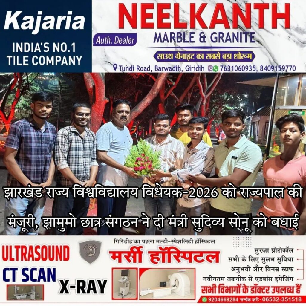 गिरिडीह : झारखंड के राज्यपाल-सह-विश्वविद्यालयों के कुलाधिपति संतोष कुमार गंगवार द्वारा ‘झारखंड राज्य विश्वविद्यालय विधेयक, 2026’ को स्वीकृति दिए जाने के बाद राज्य के शिक्षा जगत में सकारात्मक माहौल बन गया है। इस महत्वपूर्ण निर्णय पर झामुमो छात्र संगठन ने राज्य सरकार को बधाई दी है।