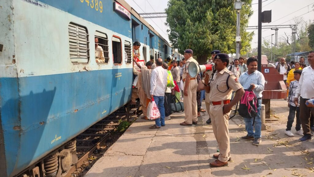 फ़ोटो:-ध्वनि विस्तारक यंत्र से यात्रियों को जागरूक करते आरपीएफ