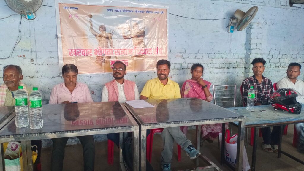 खरवार भोगता समाज विकास संघ जिला कार्यसमिति की बैठक शुक्रवार को होटल मंगल के प्रशाल में हुई। जिसमें 21 मार्च को केंद्रीय सरहुल जुलूस में भोगता समाज की सहभागिता और 28 मार्च को प्रथम स्वतंत्रता सेनानी नीलांबर पीतांबर शाही भोगता के शहादत दिवस कार्यक्रम के आयोजन पर विचार विमर्श किया गया। बैठक की अध्यक्षता खरवार भोगता समाज विकास संघ के जिला अध्यक्ष जीतू प्रधान ने की। कहा कि भोगता समाज प्रकृति पूजक है। प्रकृति पर्व सरहुल में बढ़ चढ़ कर हिस्सा लेना है और केंद्रीय सरहुल जुलूस में एक दर्जन से अधिक खोड़हा दल को शामिल होने के लिए गांव-गांव में प्रचार करने पर विचार विमर्श किया गया। कहा कि जो गांव के खोड़हा दल जुलूस में शामिल होना चाहते हैं वे जिला कमेटी को सूचित करेंगे। आगामी 28 मार्च को नीलांबर पीतांबर का शहादत दिवस आस्था और विश्वास के साथ जिला कार्यालय के सभागार में मनाए जाने का निर्णय लिया गया। बैठक में प्रमंडलीय अध्यक्ष मंगल सिंह भोगता, जिला अध्यक्ष जीतु प्रधान, सचिव भरत प्रधान, कोषाध्यक्ष शिव शंकर भोगता, प्रवीण प्रधान, कपिल प्रधान, राधेश्वर प्रधान, बसंत प्रधान, अकलु प्रधान, बंधन भोगता, लालमुनी देवी, दशरथ भोगता, सहदेव भोगता, अमसु भोगता, हीराला प्रधान, धनेश्वर भोगता, जगत भोगता, तुलसी प्रधान आदि शामिल थे।