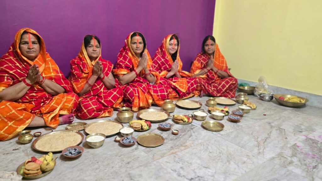 खरना के दिन व्रतियों द्वारा शाम में पूजा अर्चना के बाद गुड़ की खीर आदि प्रसाद का ग्रहण किया