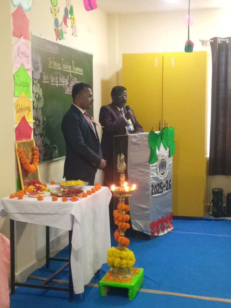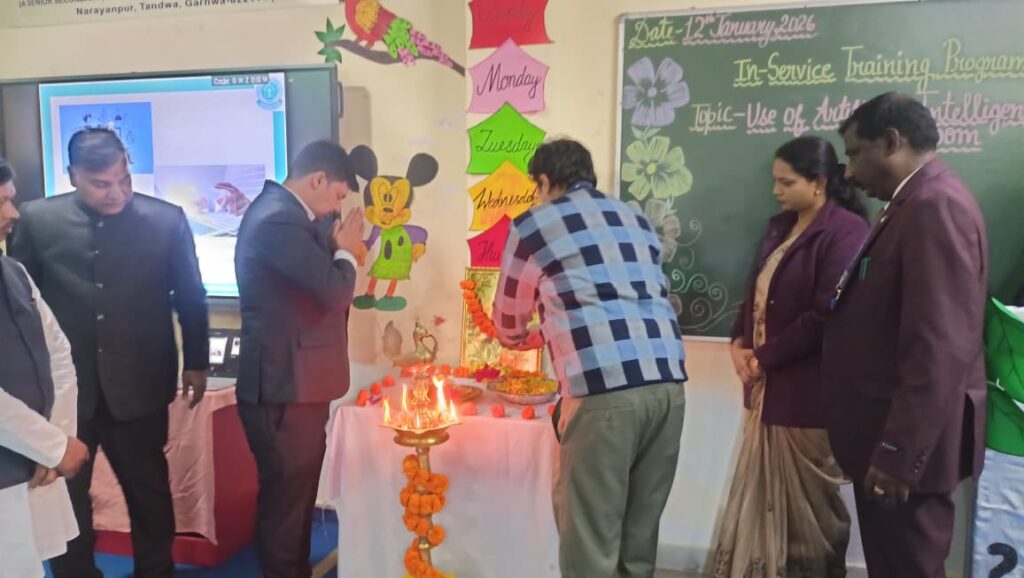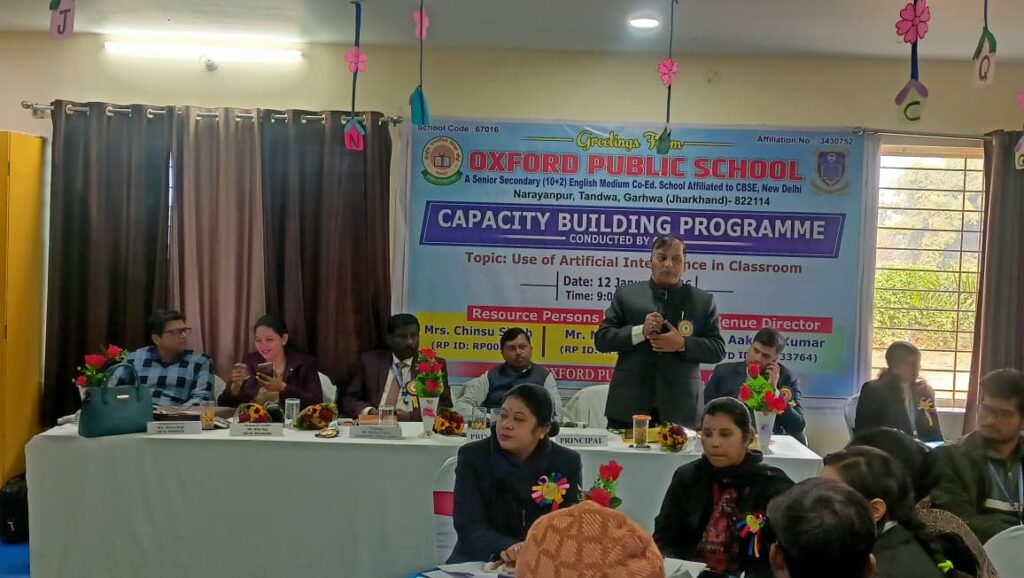 गढ़वा । टंडवा, नारायणपूर स्थित ऑक्सफोर्ड पब्लिक स्कूल में “कक्षा शिक्षण में एआई के उपयोग की अहम भूमिका एवं उपयोग ” पर सीबीएसई द्वारा शिक्षक प्रशिक्षण कार्यक्रम का सफल आयोजन किया गया। कार्यक्रम की शुरुआत गणेश वंदना, सरस्वति पूजन के उपरांत विद्यालय प्रबंधन समिति सदस्य श्री आकाश सोनी, आये हुए आदरणीय प्रशिक्षक श्री नितिन राज, प्रशिक्षिका श्रीमती चिंशु सिँह,विद्यालय के प्रधानाचार्य महोदय श्री माइकल उमेश, बी. सी. बी. पी. एस, विश्रामपुर के प्रधानाचार्य महोदय श्री उमाशंकर सिंह तथा मिलेनियम पब्लिक स्कूल, श्री वंशीधर, गढ़वा के प्रधानाचार्य महोदय मोo मुमताज़ राही के कर कमलों द्वारा दीप प्रज्ज्वलन कर किया गया।
