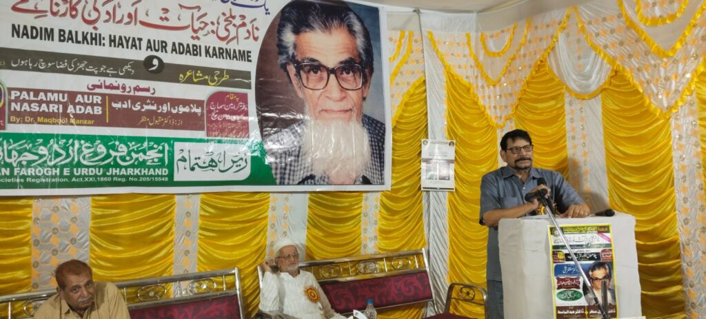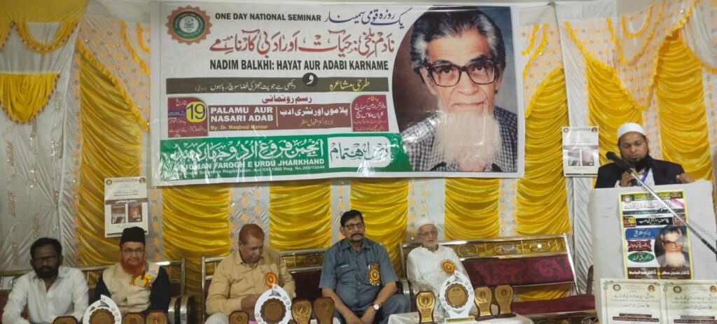 मेदिनीनगर : अंजुमन फ़रोग-ए-उर्दू, पलामू इकाई के तत्वावधान में “नादिम बल्खी : शख्सियत और अदबी कारनामे” विषय पर आयोजित राष्ट्रीय सेमिनार में उर्दू साहित्य के इस महान हस्ताक्षर को भावपूर्ण श्रद्धांजलि दी गई। कार्यक्रम में वक्ताओं ने नादिम बल्खी की साहित्यिक, मानवीय और सांस्कृतिक विरासत को विस्तार से रेखांकित किया।