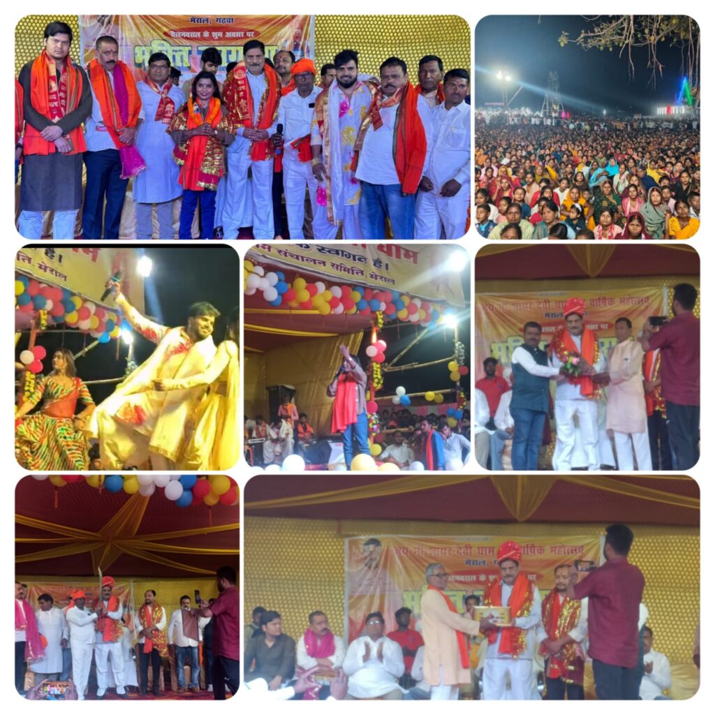 मेराल के प्रसिद्ध मां शायर देवी धाम के 6वां वार्षिक महोत्सव भव्य भक्ति जागरण कार्यक्रम के साथ संपन्न हुआ। भक्ति जागरण कार्यक्रम का उद्घाटन क्षेत्रीय विधायक सत्येंद्र नाथ तिवारी डॉ अनिल साह देवी धाम संचालन समिति के मुख्य संरक्षक प्रेमचंद प्रसाद उपाध्यक्ष कृष्ण प्रसाद कुशवाहा अतहर अली अंसारी मुखिया राम सागर महतो मुन्ना राम दशरथ प्रसाद रितेश दुबे आदि लोगों ने संयुक्त रूप से फीता काटकर तथा दीप प्रज्वलित कर किया। कार्यक्रम के मुख्य अतिथि विधायक सत्येंद्र नाथ तिवारी को देवी धाम संचालन समिति के अध्यक्ष विजय प्रसाद गुप्ता रविंद्र प्रसाद अजय प्रसाद गुप्ता रुपू महतो आदि लोगों ने फूल माला, बुके एवं चुनरी, पगड़ी बांध कर तथा तलवार भेंट कर सम्मानित किया। इसके अलावा अन्य गाने मां अतिथियों को भी अंग वस्त्र एवं पत्ता देकर के सम्मानित किया गया। कार्यक्रम को संबोधित करते हुए विधायक सत्येंद्र नाथ तिवारी ने जय श्री राम के उद्घोष के साथ मां शायर देवी धाम संचालन समिति के लोगों की सराहना करते हुए कहा कि इस तरह के सफल धार्मिक आयोजन के लिए बधाई के पात्र हैं उन्होंने कहा कि जब से देश में प्रधानमंत्री नरेंद्र मोदी की सरकार बनी है तब से सनातन संस्कृति ध्वज पताका लहरा रहा है और धर्म के प्रचार प्रसार बढ़ा है और अपने धर्म के प्रति लोगों में एकजुटता आई है । इनके अलावा डॉअनिल शाह भाजपा नेता रितेश दुबे आदि लोगों ने भी कार्यक्रम की सराहना करते हुए अपना-अपना विचार रखा। विधायक प्रतिनिधि डॉ लालमोहन ने घोषणा किया कि विधायक निधि से सामुदायिक शौचालय एवं छठ घाट तथा शुद्ध पेयजल की व्यवस्था किया जाएगा।कार्यक्रम से पहले क्षेत्रीय विधायक सत्येंद्र नाथ तिवारी ने मां शायर देवी धाम मां जाकर मत्था टेका। भक्ति जागरण कार्यक्रम की शुरुआत में भोजपुरी स्टार गायक मोनू अलबेला ने गणेश वंदना तथा जन्मे है राम रघुरइया मेराल में बाजे बधाइयां हो रामा गाकर दर्शकों को झूमने पर मजबूर किया इसके अलावा एक से बढ़कर एक भक्ति गीत गाया। भोजपुरी गायिका अदिति राज ने दरबार तेरे दरबारा में एक खास अहमियत रखता है उसको वैसा मिल जाता है जो जैसी नियत रखता है..।आइल द्वार बानी हे देवी माई तथा मंगल भवन अमंगल हारी गाकर दर्शकों का मन मोह लिया। इस अवसर पर विधायक प्रतिनिधि विवेकानंद तिवारी देवी धाम संचालन समिति के मुख्य संरक्षक संजय भगत विनोद प्रसाद महेंद्र प्रसाद अशोक राम मंगल यादव बिरझन राम नवीन जायसवाल अशोक ठाकुर धनंजय चौधरी रोहित कुमार विनोद कुशवाहा वीरेंद्र प्रसाद प्रमोद महाजन दीपलेश्वर सिंह सहित हजारों की संख्या में महिला पुरुष कार्यक्रम का आनंद उठाया।