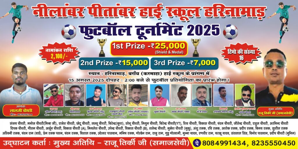 गढ़वा/हरिनामार – स्वतंत्रता दिवस के अवसर पर नीलांबर-पीतांबर हाई स्कूल, हरिनामार में भव्य फुटबॉल टूर्नामेंट 2025 का आयोजन किया जा रहा है। यह प्रतियोगिता 15 अगस्त 2025 को हरिनामार, बराव करमहा मैदान में दोपहर 2 बजे से शुरू होगी।