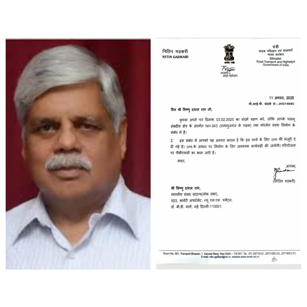 पलामू माननीय सांसद पलामू श्री विष्णु दयाल राम के अथक प्रयासो के फलस्वरूप NH-343 गढ़़वा से रामानुजगंज तक लगभग 50 किलोमीटर सड़क का फोरलेन निर्माण हेतु विस्तृत प्रोजेक्ट रिपोर्ट (DPR) की स्वीकृति सड़क परिवहन एवं राजमार्ग मंत्रालय, भारत सरकार के द्वारा प्रदान की गयी है