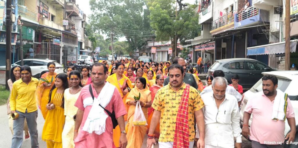 पलामू- श्रावण मास के शुभ अवसर पर मेदिनीनगर शहर के जेलहाता ठाकुर बाड़ी मंदिर से आज भगवान भोलेनाथ की कलश यात्रा निकाली गई। ।