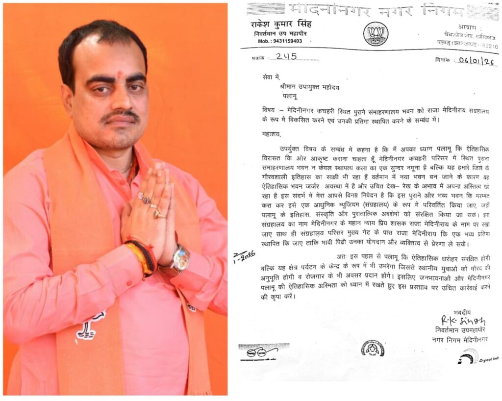 मेदिनीनगर कचहरी स्थित पुराने समाहरणालय भवन को राजा मेदिनीराय संग्रहालय के रूप में विकसित करने एवं उनकी प्रतिमा स्थापित करने के सम्बंध में निवर्तमान उपमहापौर राकेश कुमार सिंह (मंगल सिंह) जी ने उपायुक्त महोदय को लिखा पत्र।