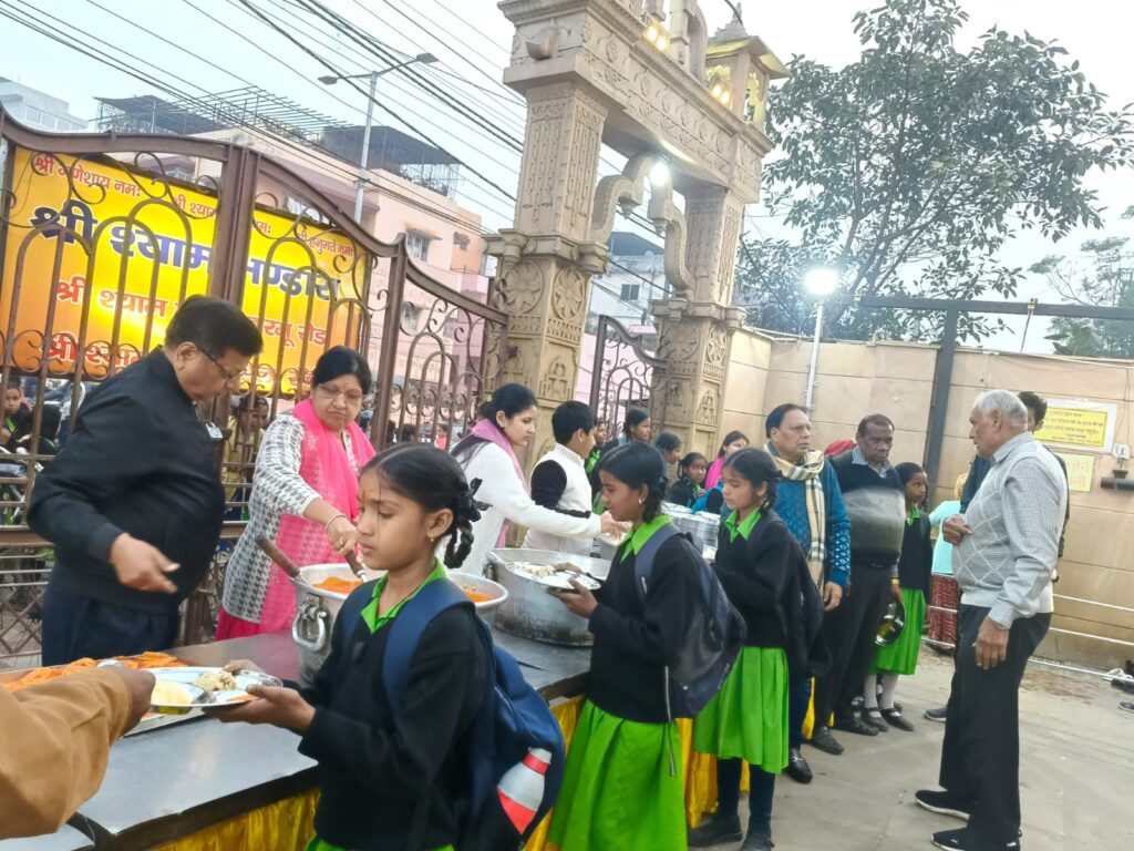 रांची 20 दिसंबर :182 वा श्री श्याम भंडाराश्री श्याम मित्र मंडल द्वारा हरमू रोड के श्री श्याम मंदिर में आज 182 वा श्री श्याम भंडारा का भव्य आयोजन किया गया।श्री श्याम मित्र मंडल के अध्यक्ष गोपाल मुरारका महामंत्री गौरव अग्रवाल यजमान अशोक गाड़ोदिया चंदा गाड़ोदिया अंकुर स्नेहा अंकित शिप्रा गाड़ोदिया निवर्तमान अध्यक्ष सुरेश सरावगी निर्वतमान महामंत्री विश्वनाथ नारसरिया वरिष्ठ कार्यकारणी सदस्य श्यामसुंदर शर्मा रतन शर्मा ने संयुक्त रूप से श्री श्याम भोग का भजन गायन किया। मंदिर में उपस्थित सैकड़ो भक्तों ने आओ आओ भोग लगाओ बाबा श्याम जी रुच रुच भोग लगाओ बाबा श्याम जी के स्वर में स्वर मिलाकर भक्ति भावना से ओत प्रोत होकर ठाकुर जी से भोग स्वीकार करने का अनुरोध किया। खाटूनरेश बजरंगबली शिव परिवार लड्डू गोपाल जी शालिग्राम जी गरुड़ जी गुरुजनों का भोग लगाकर महाप्रसाद को विशाल भंडारे में मिश्रित किया गया।अशोक गाड़ोदिया चंदा गाड़ोदिया ने सर्वप्रथम मंदिर के आचार्यों को भोग प्रसाद खिलाकर आशीर्वाद प्राप्त किया। भंडारे का समय होते-होते श्री श्याम मंदिर परिसर भक्तों से भर गया एवं हरमू रोड में भक्तजनों की लंबी-लंबी कतारें लग गई। खाटूनरेश की जय जयकारों से पूरा हरमू रोड गूंज रहा था। प्रथम देव श्री गणेश जी महाराज की जय जयकारों के बीच श्री श्याम भंडारे का प्रसाद वितरण प्रारंभ किया गया।श्री श्याम मंदिर में निर्मित प्रसाद में आज के भंडारे में वेजिटेबल उपमा इडली चटनी केसरिया जलेबी का प्रसाद वितरण किया गया।खीर चूरमा का भोग हर भंडारे में वेजिटेबल महाप्रसाद के रूप में श्याम मंदिर में निर्मित किया जाता है एवं सर्वप्रथम भोग लगाया जाता है।भोग लगने के बाद हर भंडारे में मंडल के वरिष्ठ सदस्य रतन शर्मा एवं मंदिर के सहयोगी रांची गौशाला में जाकर गौमाता को भोजन कराते हैं। लगभग 2800 से ज्यादा भक्तजनों ने प्रसाद प्राप्त किया। श्री श्याम भंडारे का प्रसाद मंदिर परिसर में निर्वतमान अध्यक्ष सुरेश सरावगी की देख रेख में शुद्धता के साथ निर्मित किया गया था। श्री श्याम भंडारे में मंडल के अध्यक्ष गोपाल मुरारका उपाध्यक्ष श्रवण ढानढनिया कोषाध्यक्ष मनोज खेतान निवर्तमान अध्यक्ष सुरेश सरावगी अशोक गाड़ोदिया चंदा अंकुर स्नेहा अंकित शिप्रा गाड़ोदिया मंत्री पंकज गाड़ोदिया विष्णु चौधरी उपमंत्री प्रवीण सिंघानिया आदित्य लोहिया प्रचार मंत्री रोहित अग्रवाल कमलेश सावा वेद भूषण जैन राहुल मारू अंकित कुमार कृष्णा कुमार संकेत चौधरी मनोज खेतावत उपेन्द्र पांडे सहित 50 से ज्यादा कार्यकर्ताओं ने सहयोग दिया।