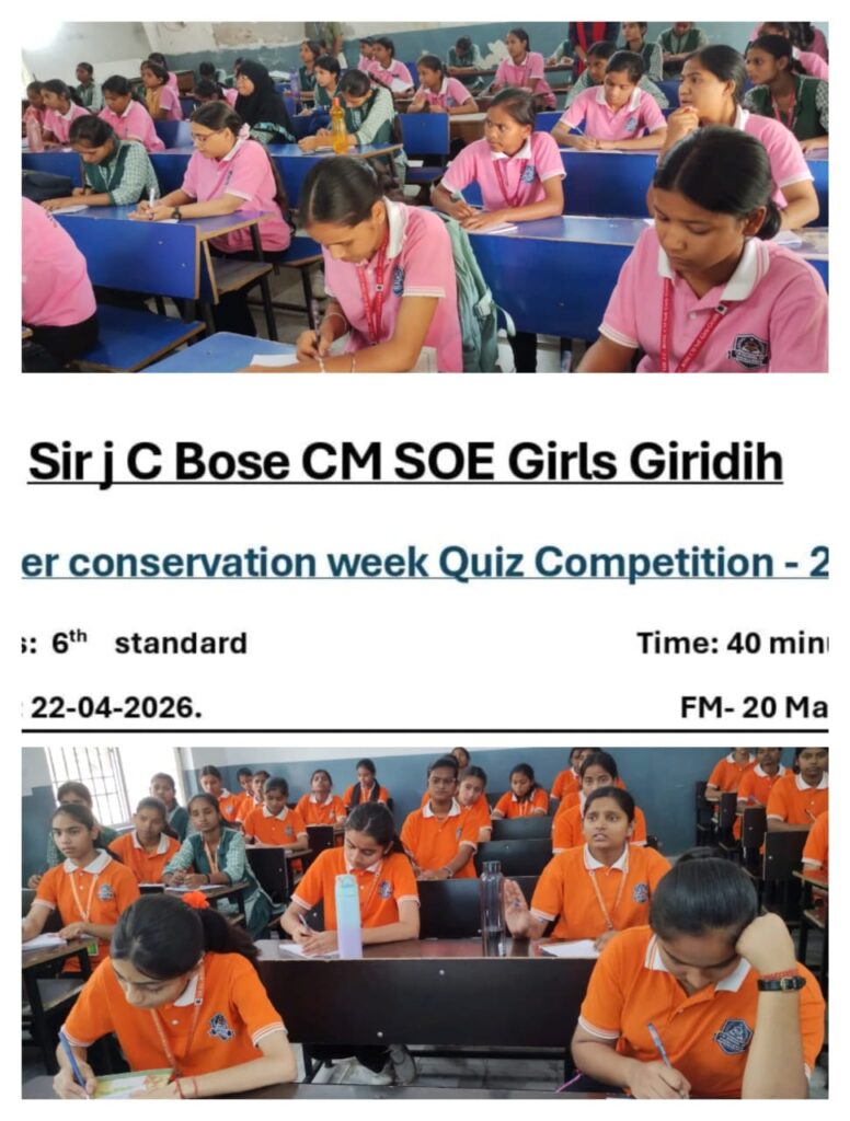 वर्ग छठा से वर्ग 12वीं तक के विद्यार्थियों के लिए जल संरक्षण और पृथ्वी से जुड़े विभिन्न मुद्दों पर लिखित क्विज प्रतियोगिता का आयोजन हुआ इसमें विद्यालय के करीब 500 से अधिक विद्यार्थियों ने भाग लिया।